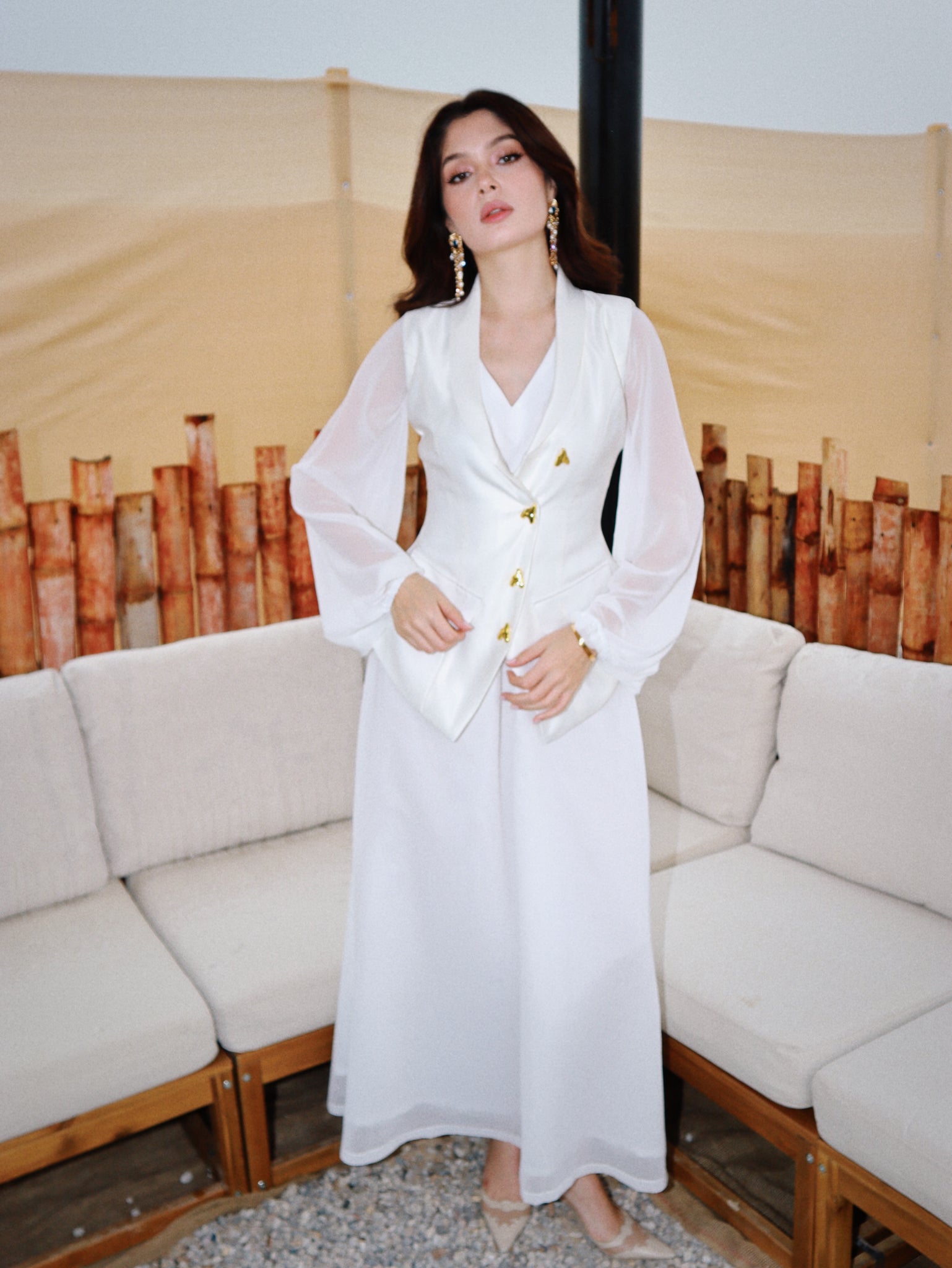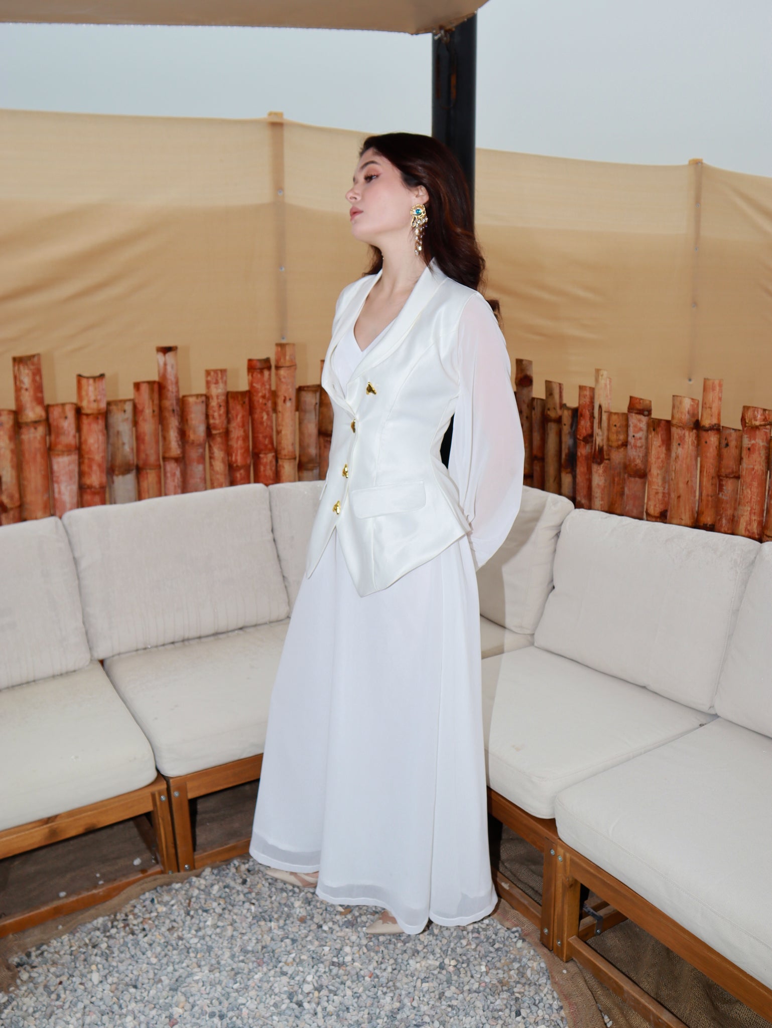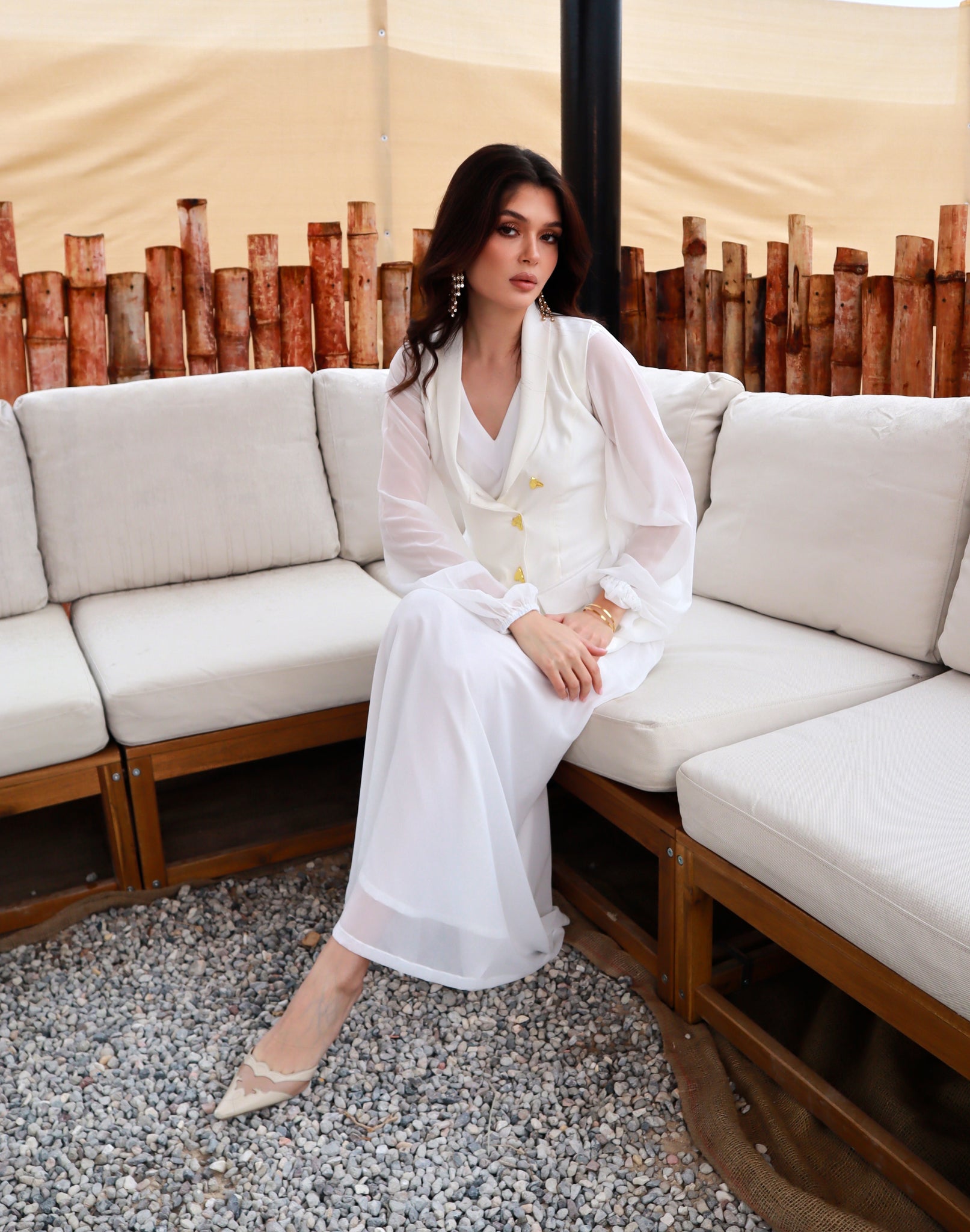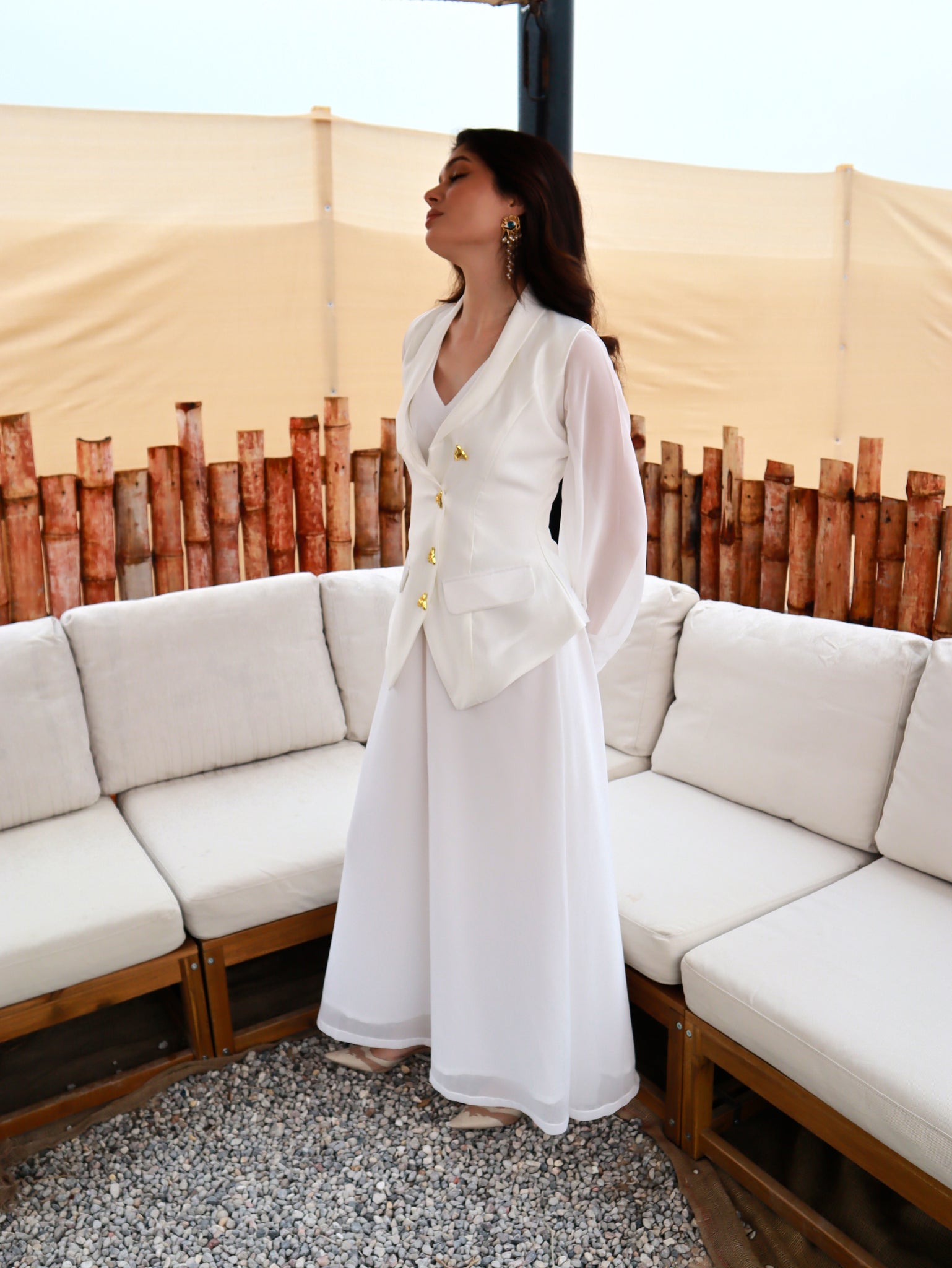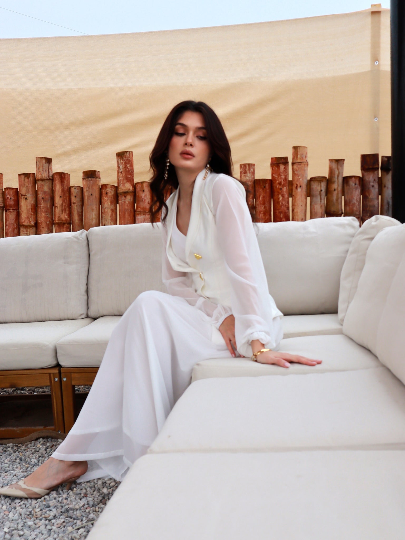 Cloud Majesty is a statement two-piece set designed in a crisp white shade that instantly elevates your look. Featuring a structured vest with a flattering draped neckline and signature gold heart buttons, paired with a flowing dress for an effortlessly elegant finish. Perfect for Ramadan gatherings and Eid celebrations, this set gives you a polished, sophisticated look.