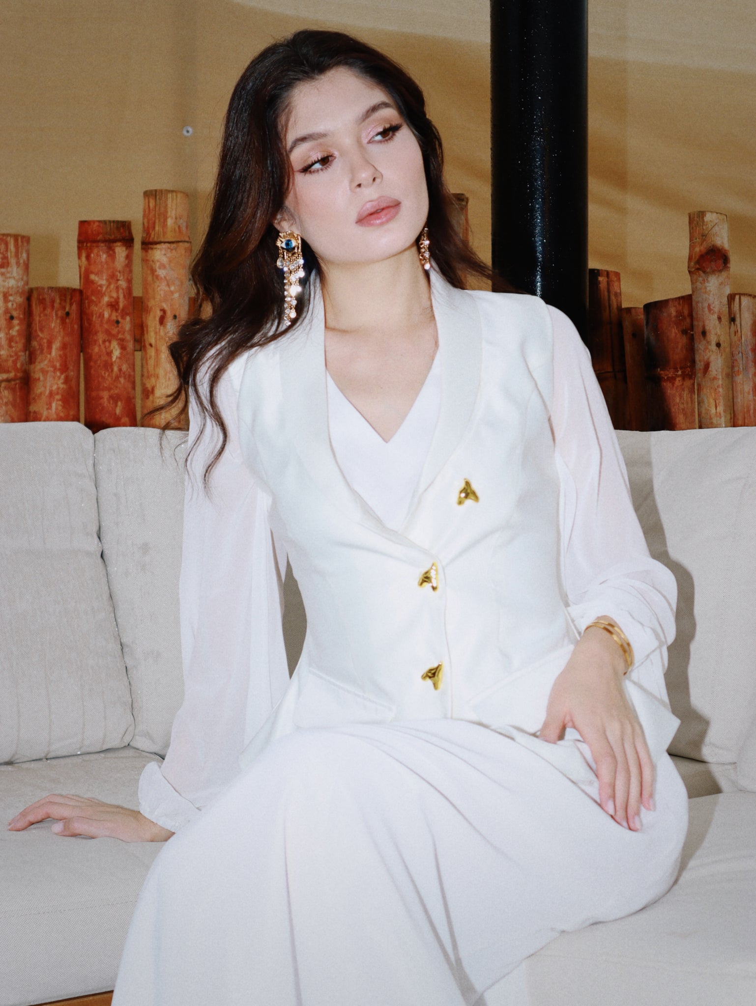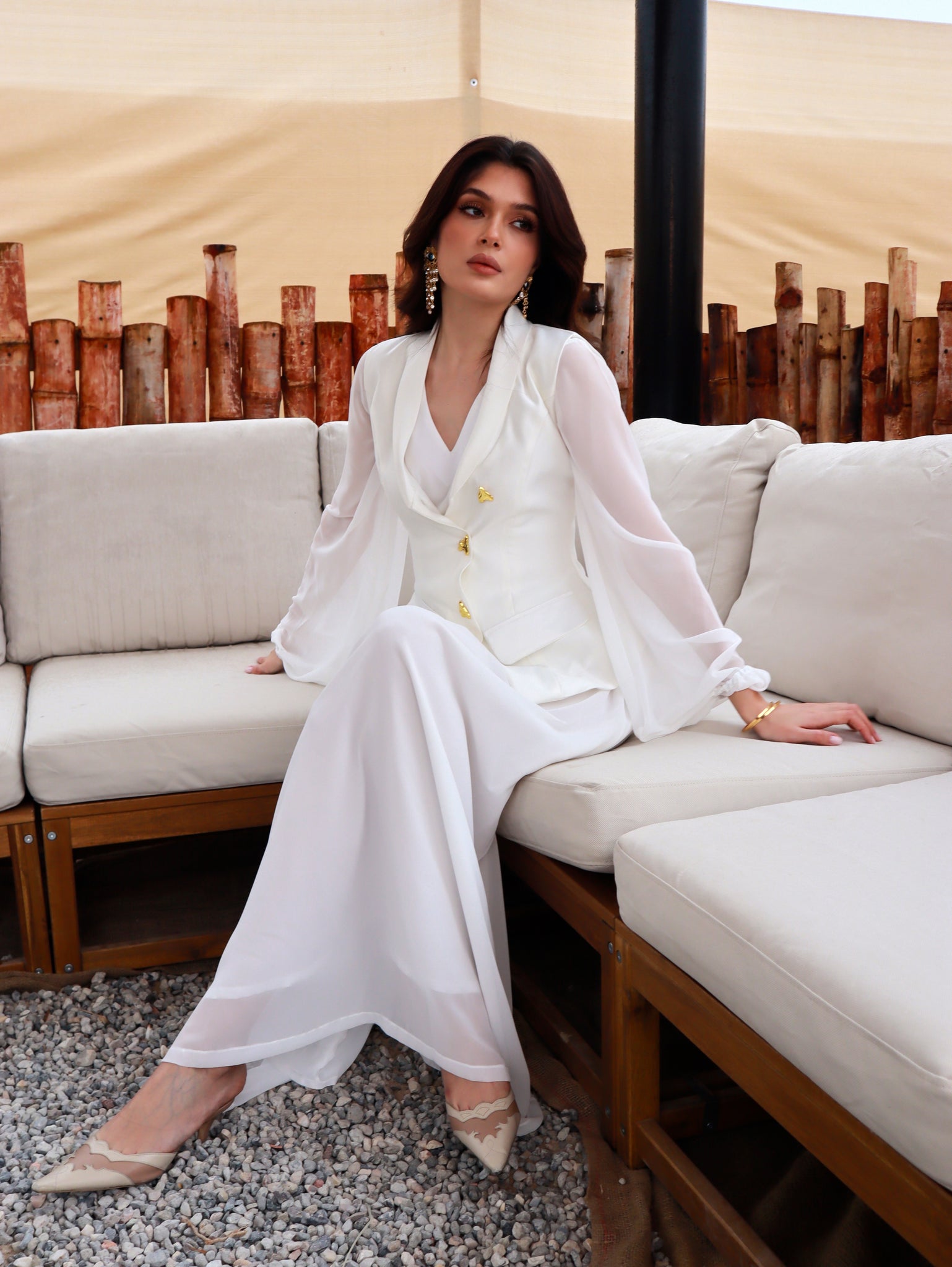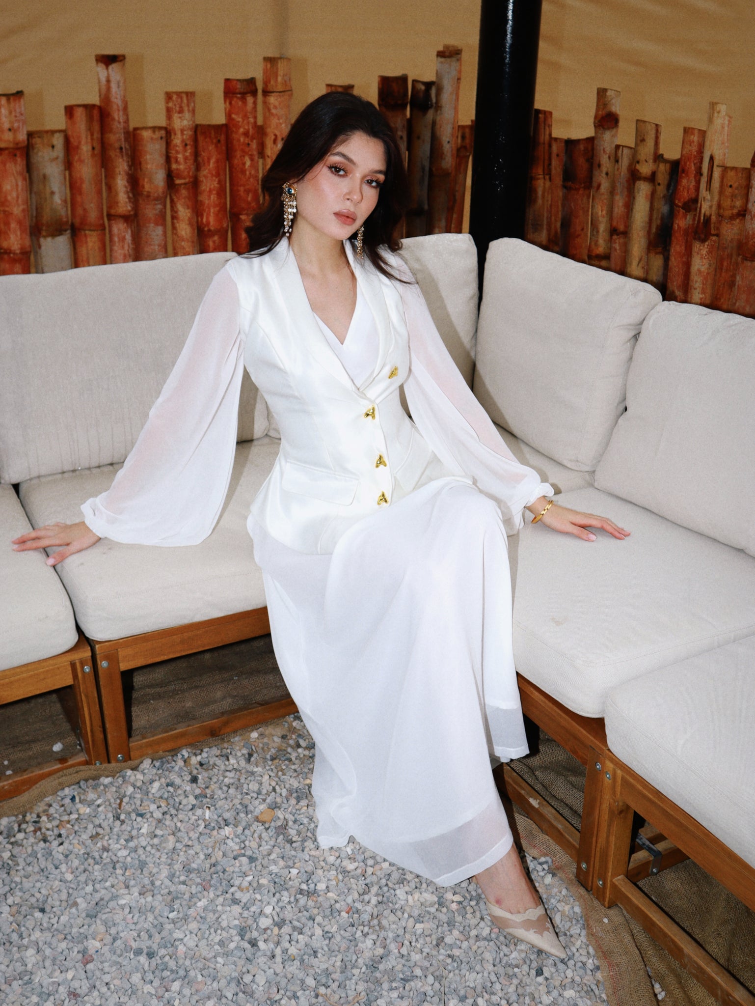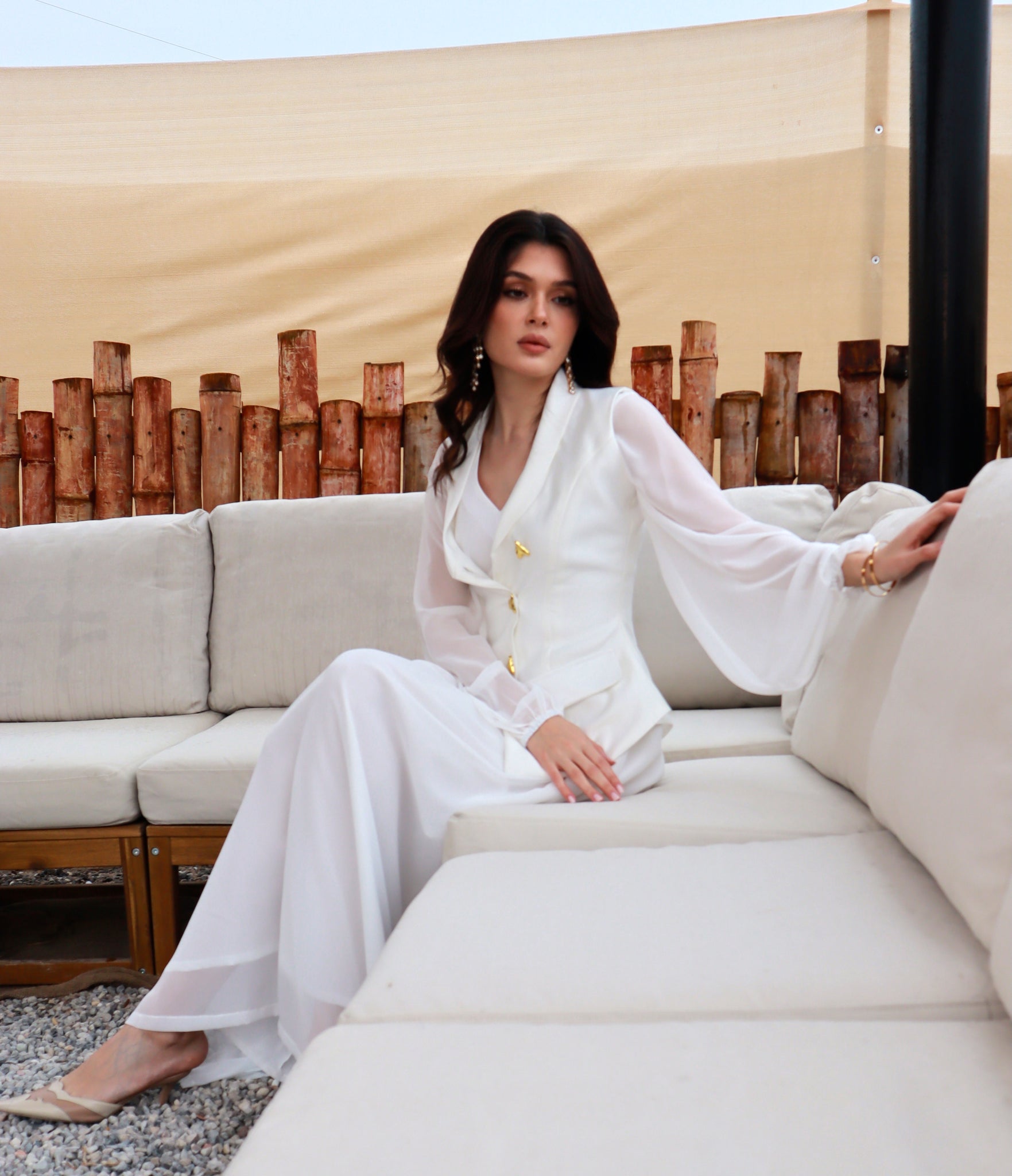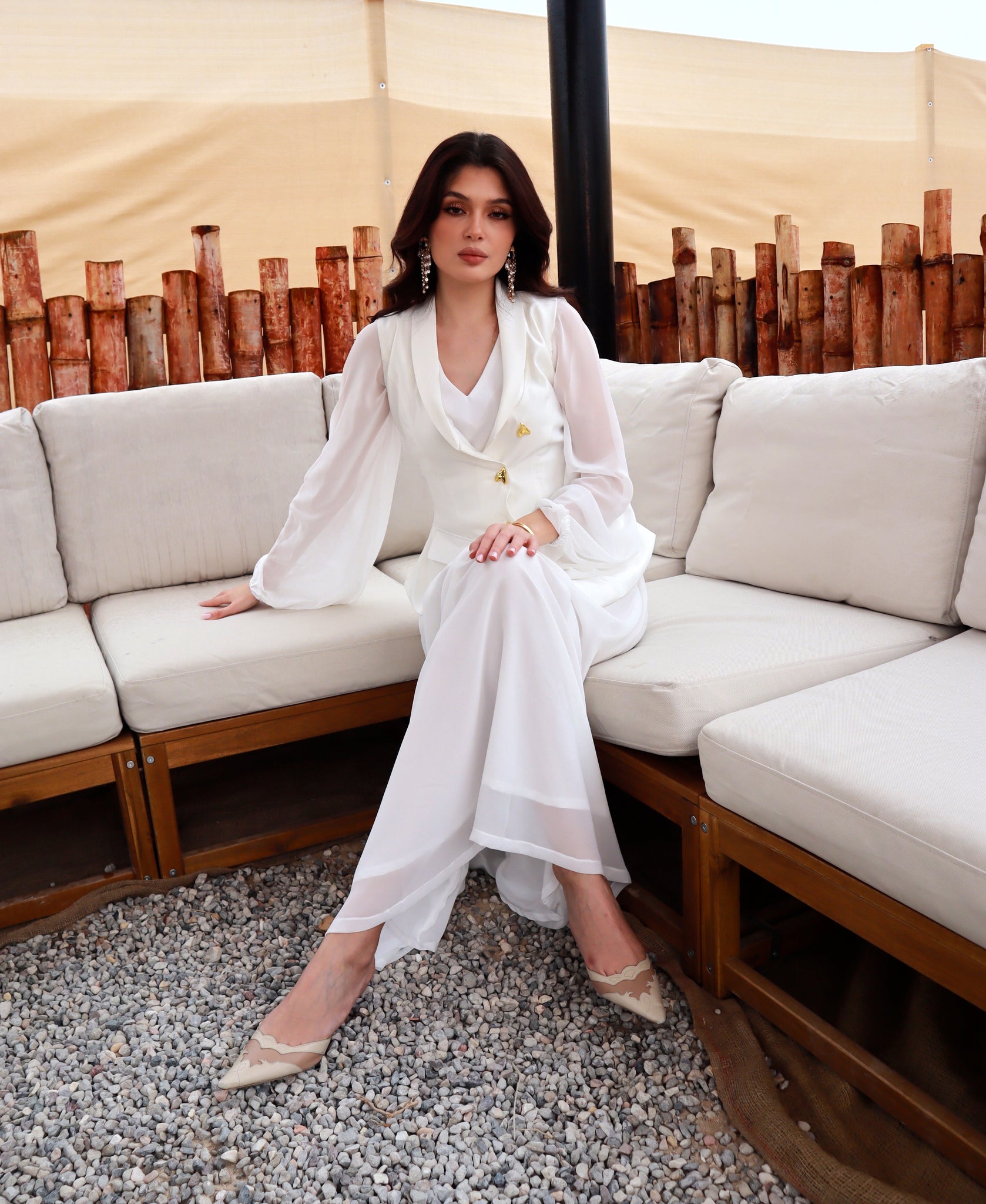 Cloud Majesty is a statement two-piece set designed in a crisp white shade that instantly elevates your look. Featuring a structured vest with a flattering draped neckline and signature gold heart buttons, paired with a flowing dress for an effortlessly elegant finish. Perfect for Ramadan gatherings and Eid celebrations, this set gives you a polished, sophisticated look.