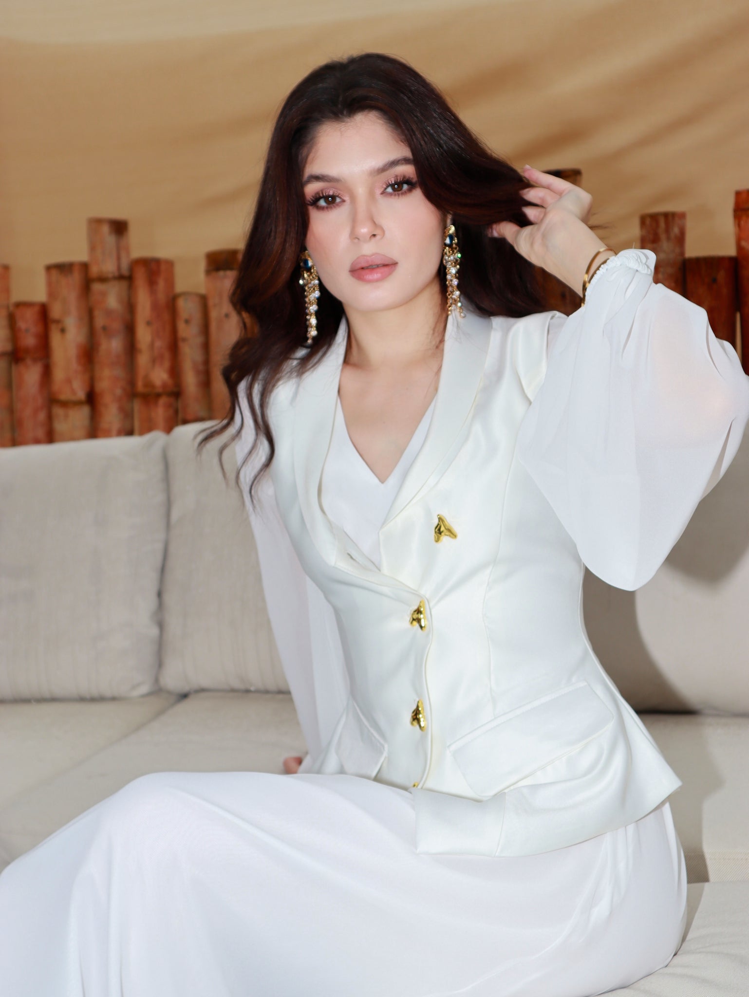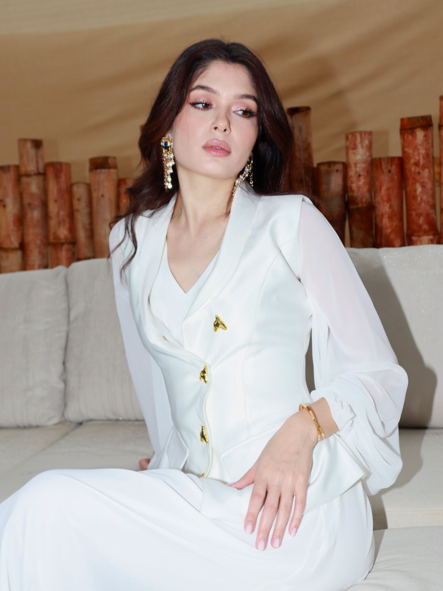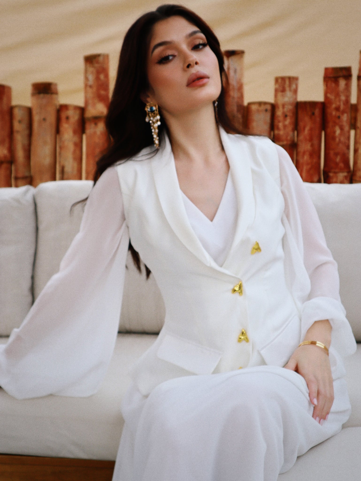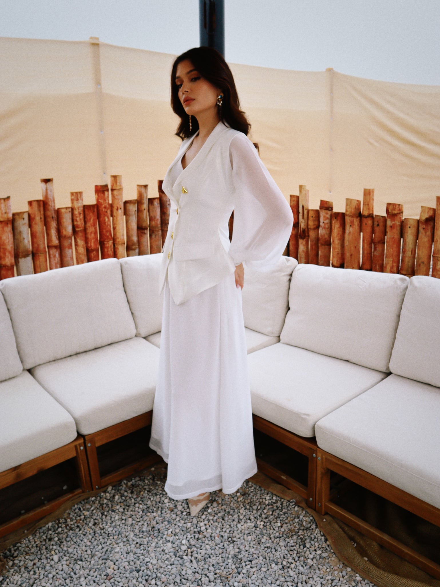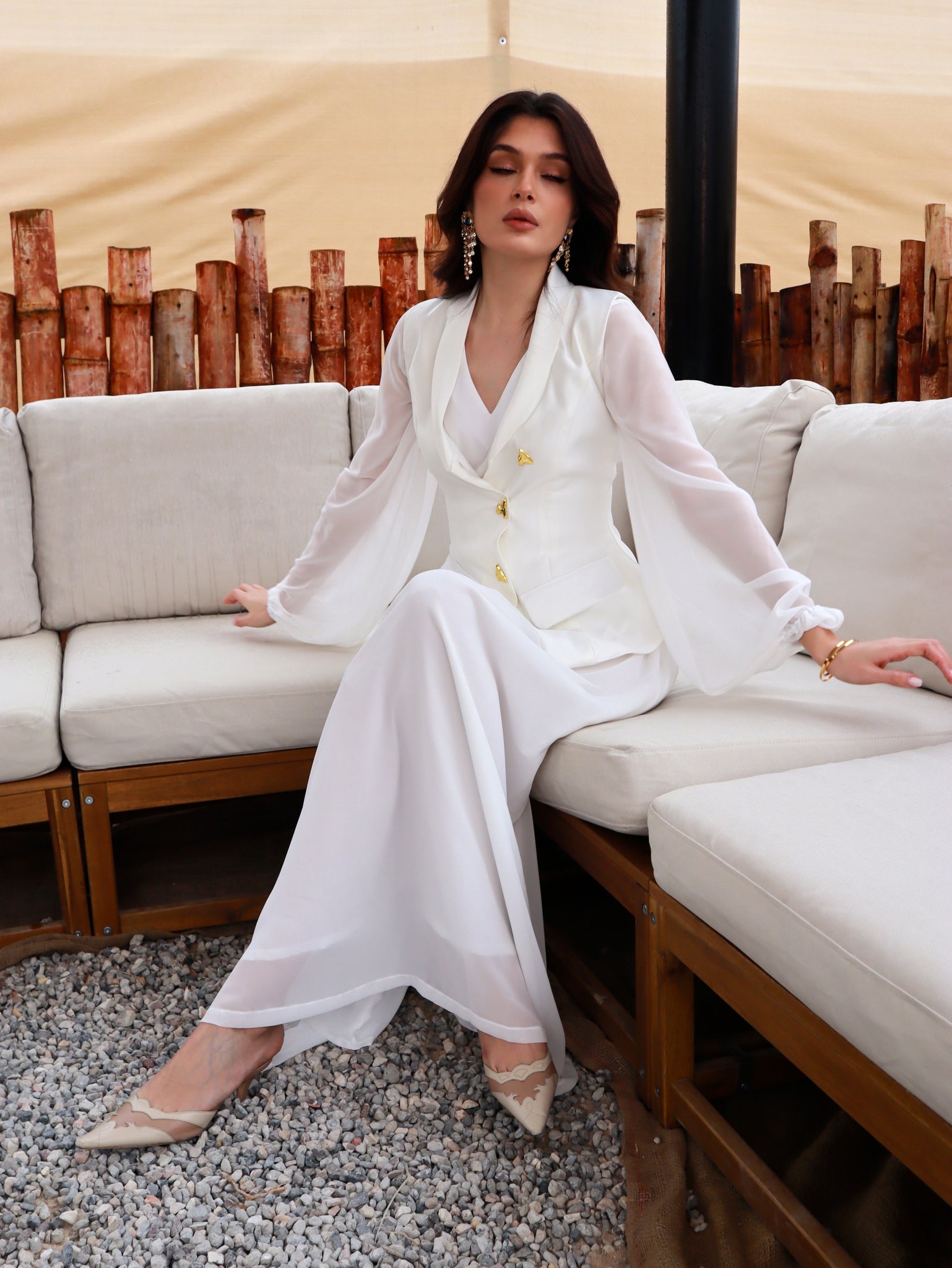 Cloud Majesty is a statement two-piece set designed in a crisp white shade that instantly elevates your look. Featuring a structured vest with a flattering draped neckline and signature gold heart buttons, paired with a flowing dress for an effortlessly elegant finish. Perfect for Ramadan gatherings and Eid celebrations, this set gives you a polished, sophisticated look.