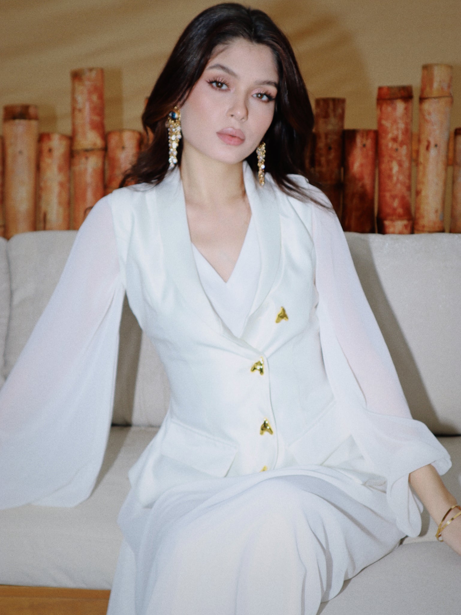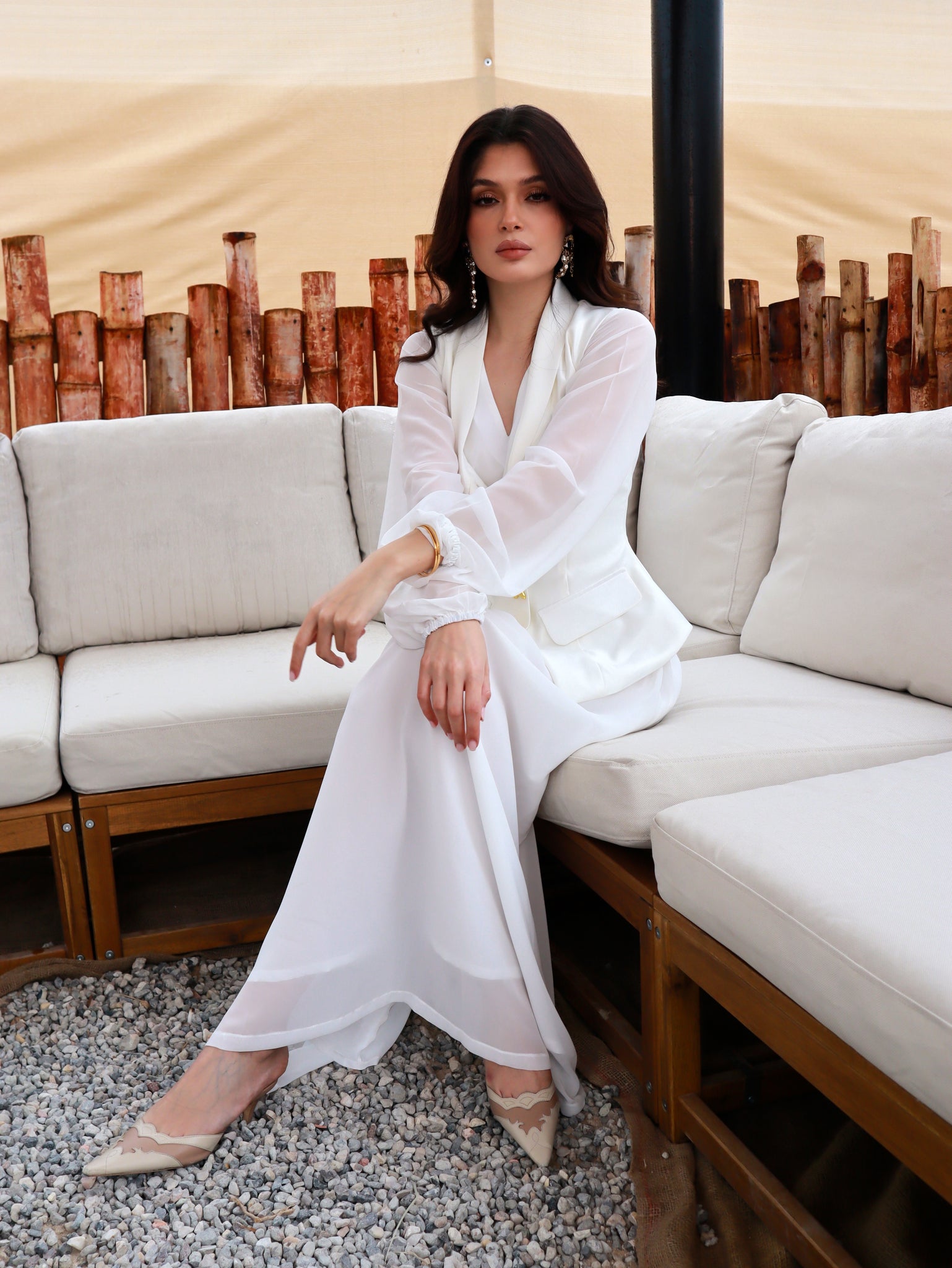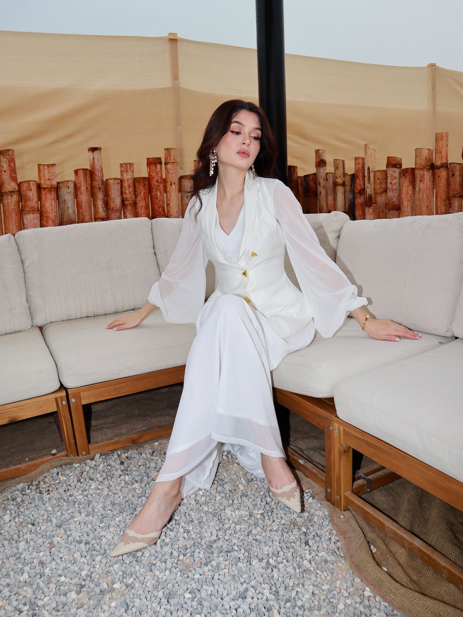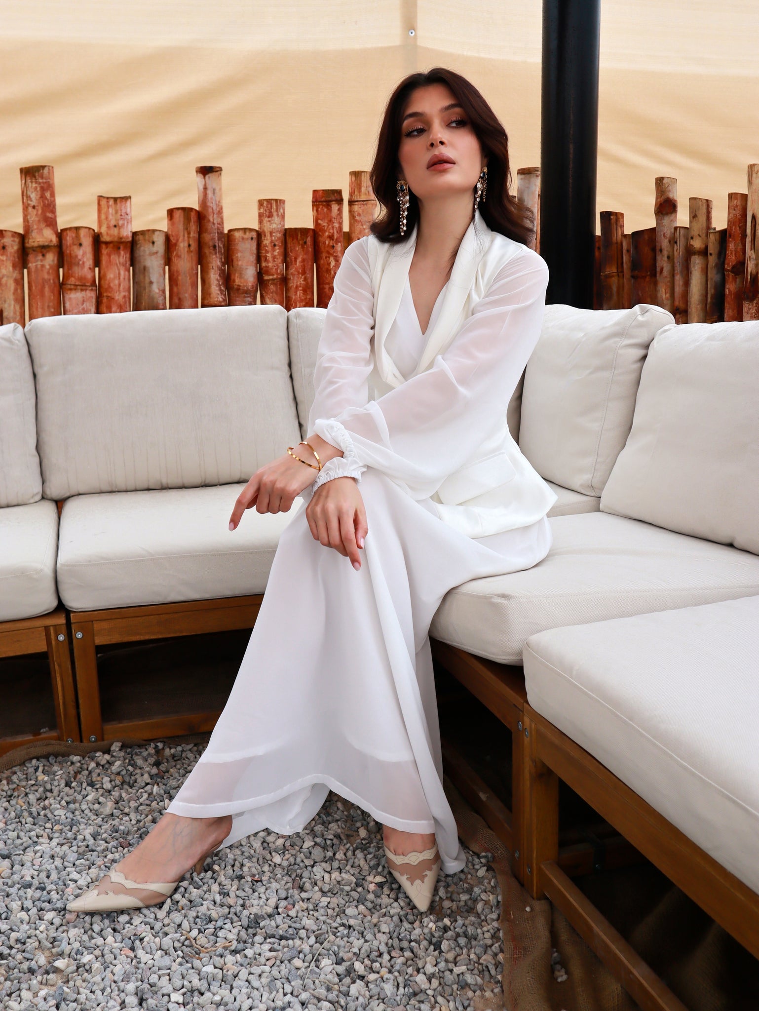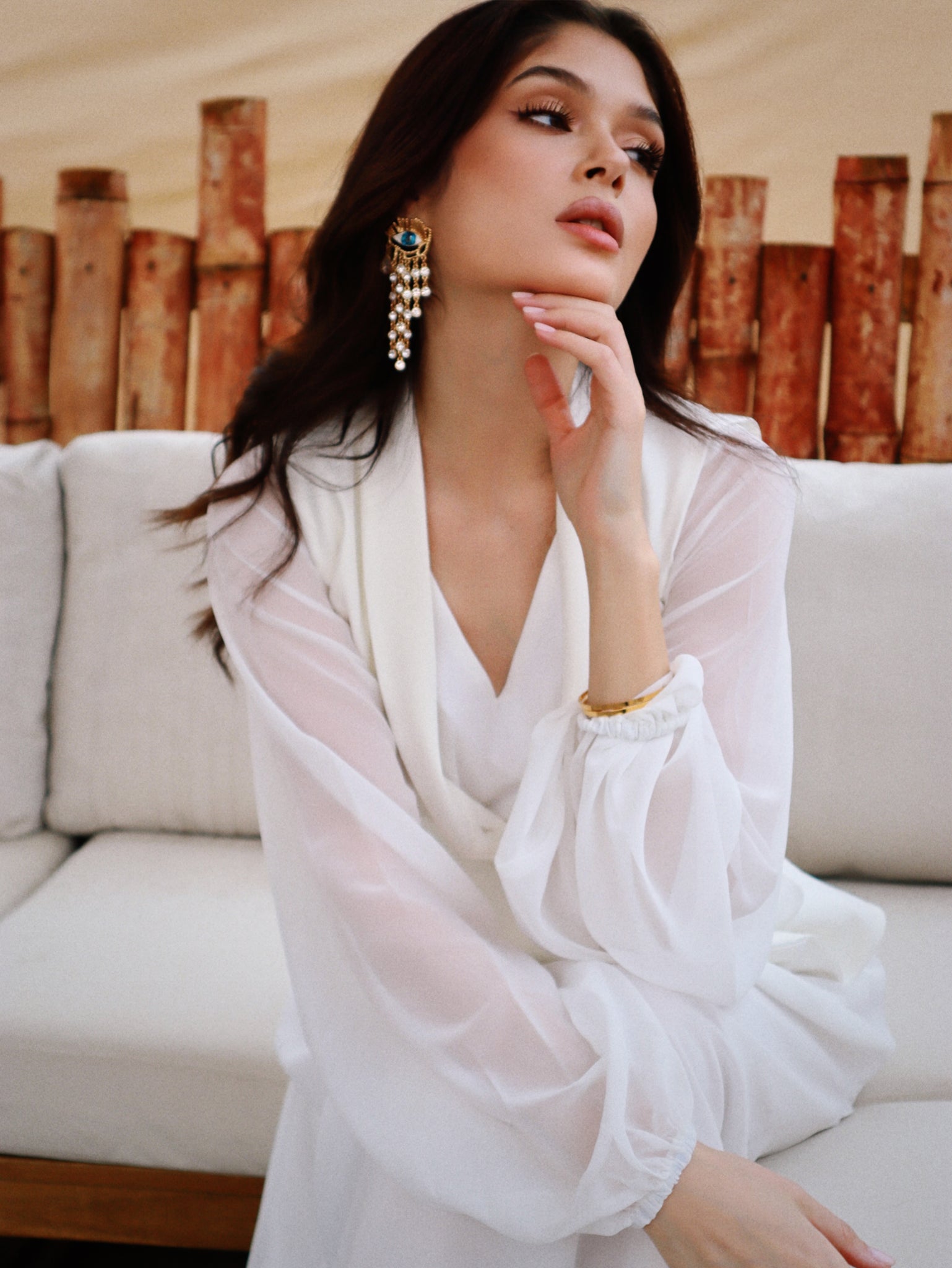 Cloud Majesty is a statement two-piece set designed in a crisp white shade that instantly elevates your look. Featuring a structured vest with a flattering draped neckline and signature gold heart buttons, paired with a flowing dress for an effortlessly elegant finish. Perfect for Ramadan gatherings and Eid celebrations, this set gives you a polished, sophisticated look.